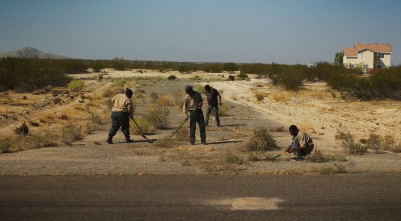 Victoria se cierra con una perogrullada simbólica que confirma el proceso de reconquista del desierto por parte de los desamparados. La América original fue arrebatada por la ambición capitalista, cuya mano condenó su propio proyecto al fracaso, sostienen las cineastas. “Cal” City es el vivo ejemplo de ello. En 1958, su promotor, Nat Mendelsohn, quiso adelantarse al crecimiento de población colonizando un espacio aparentemente muerto, de tiempo congelado. Lograría parcelar el terreno, pero la prospección resultaría fútil, y el devenir temporal, indomable. La vista en alzado de la trama de carreteras en el mapa figura como única prueba de la conquista imposible del magnate. En la realidad, la naturaleza retomó su curso, reclamando un territorio vampirizado por una lógica insostenible. Como trabajador de la empresa de conservación del lugar, Lashay ayuda a mantener el proyecto de Mendelsohn en una suerte de coma artificial, rastrillando caminos abandonados. En una escena capital, Lashay y un colega juguetean con Google Maps y se adentran en las calles de “Cal” City a través de street view. El resultado de esta navegación es una colección de imágenes fluctuantes, en las que el simple desplazamiento hacia adelante o atrás desvela un mundo deformado. El capital puede pretender someter al desierto y sus habitantes, pero el tiempo y la dimensión orgánica del mundo no son fáciles de domar, como revela el estallido informe de las imágenes de street view. Ante este torrente de imágenes caóticas, Lashay se permite bromear sobre la posibilidad de encontrar a algún amigo muerto en las estampas fantasmales de la ciudad.