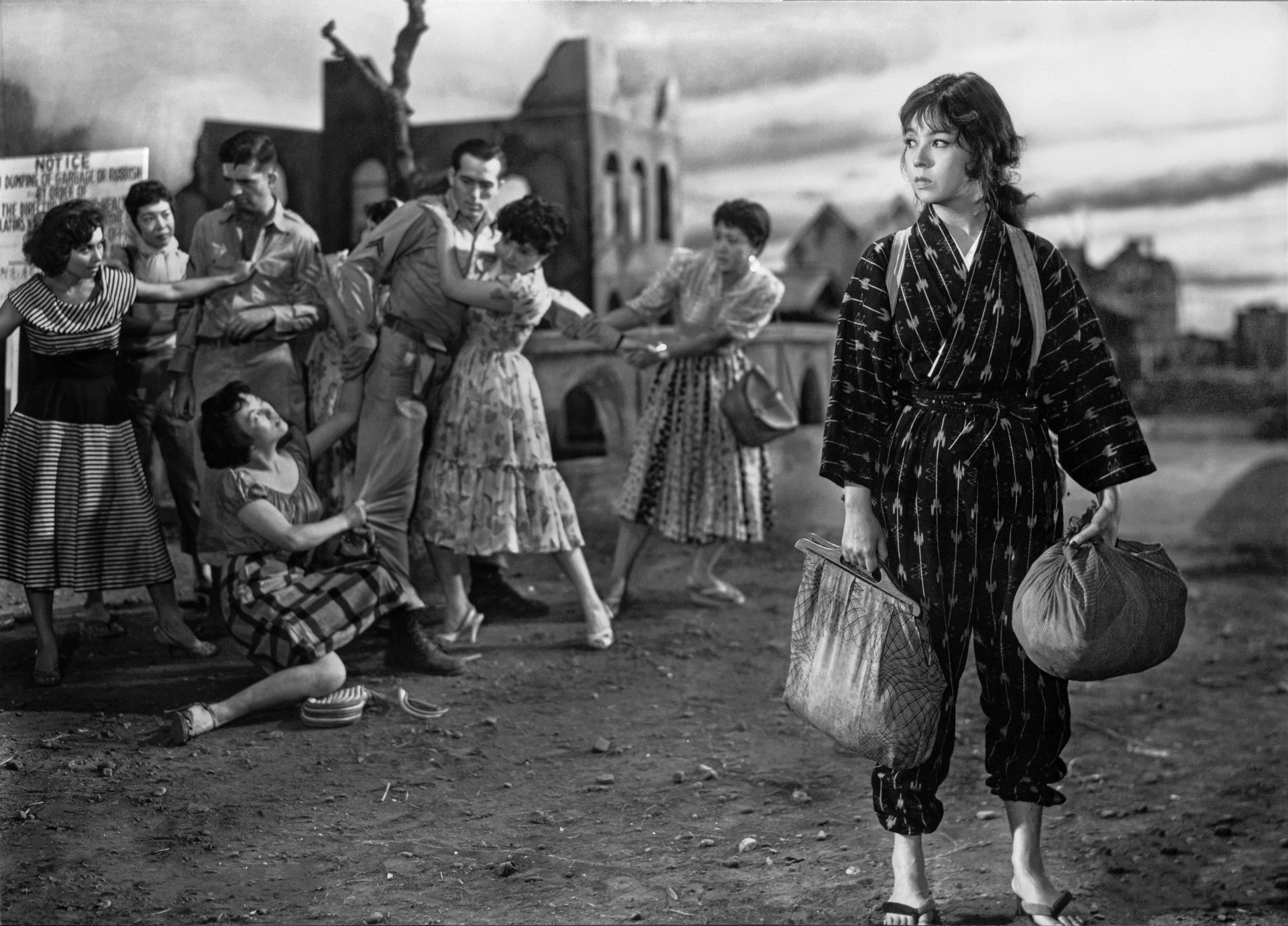 Saltemos a Yoru no suwao (La cara desnuda de la noche, 1958) y pongamos un ejemplo muy concreto. La historia se ambienta en el mundillo del baile tradicional japonés, con un grado de mimo por ese ambiente, sus usos y costumbres, sus vestidos y coreografías, quizá sin precedentes. El desenlace ocurre durante una actuación en un teatro. Entre bambalinas, la protagonista acaba siendo perseguida por un antiguo amante, sale a la calle y huye de él hasta quedar bloqueada por la barrera de una vía de tren, directamente atrapada entre la máquina y su agresor. Los encuadres de Yoshimura dentro del edificio remiten a la representación pictórica que de esto habría hecho un artista de ukiyo-e, esa técnica tan célebre de grabados de finales del XIX, mundialmente famosa por La gran ola de Kanagawa, de Katsushika Hokusai. Cuando el peligro acecha, el cuadro se va cerrando y cobra fuerza cinética, hasta el punto de ser tan atropellado y deslavazado en el montaje en el exterior, que da la impresión de ir a menor velocidad, un poco como en el cine mudo, en algún lugar entre el thriller y la sinfonía urbana. Es habitual que Yoshimura juegue con estos contrastes entre tradición y modernidad y que lo haga pensando desde el dispositivo cinematográfico.